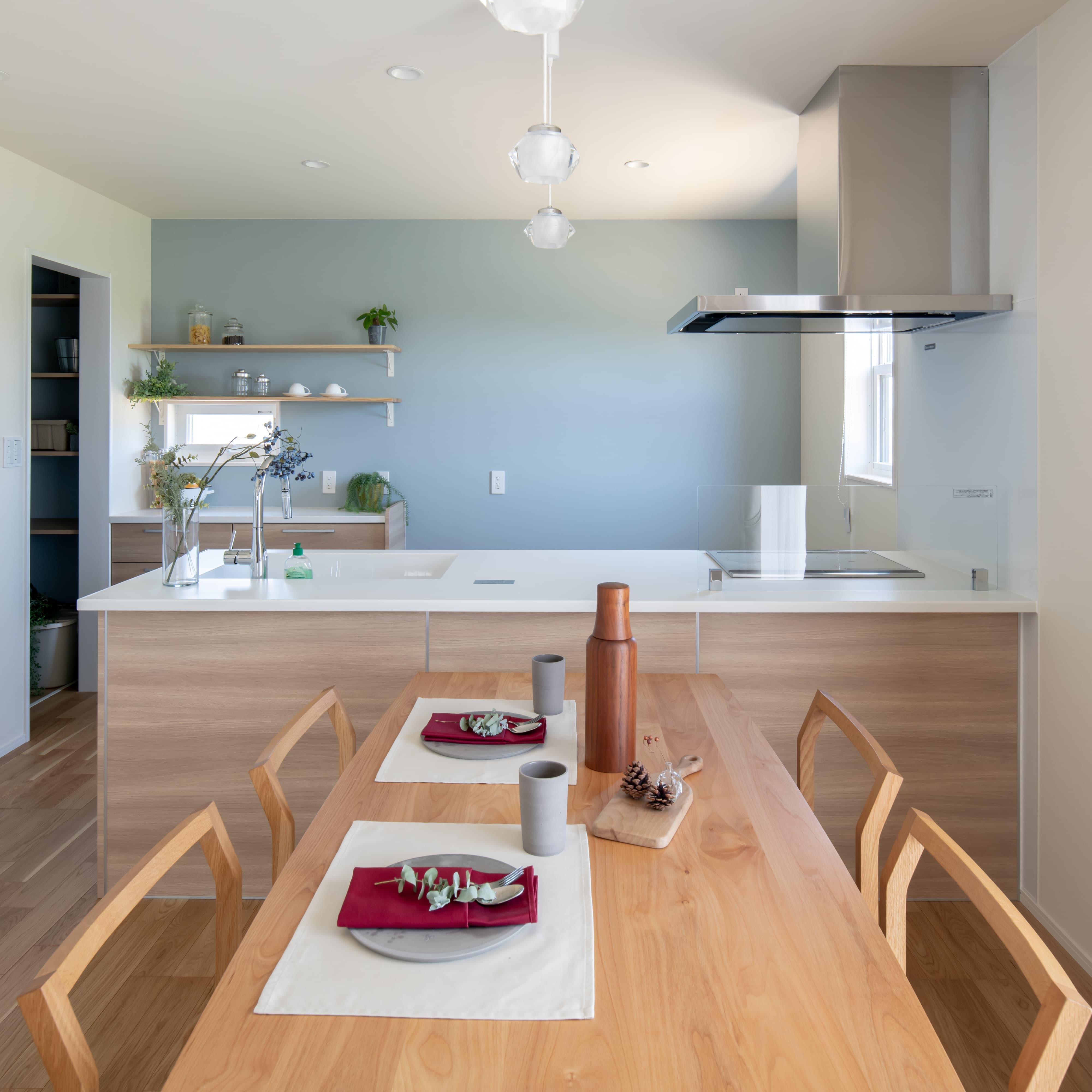LDKは真っ直ぐに配置することにより、リビングでお子さんが遊んでいてもキッチンから見渡せるようにプランニングし、キッチンは家族みんなでお料理ができるように広めにしました。