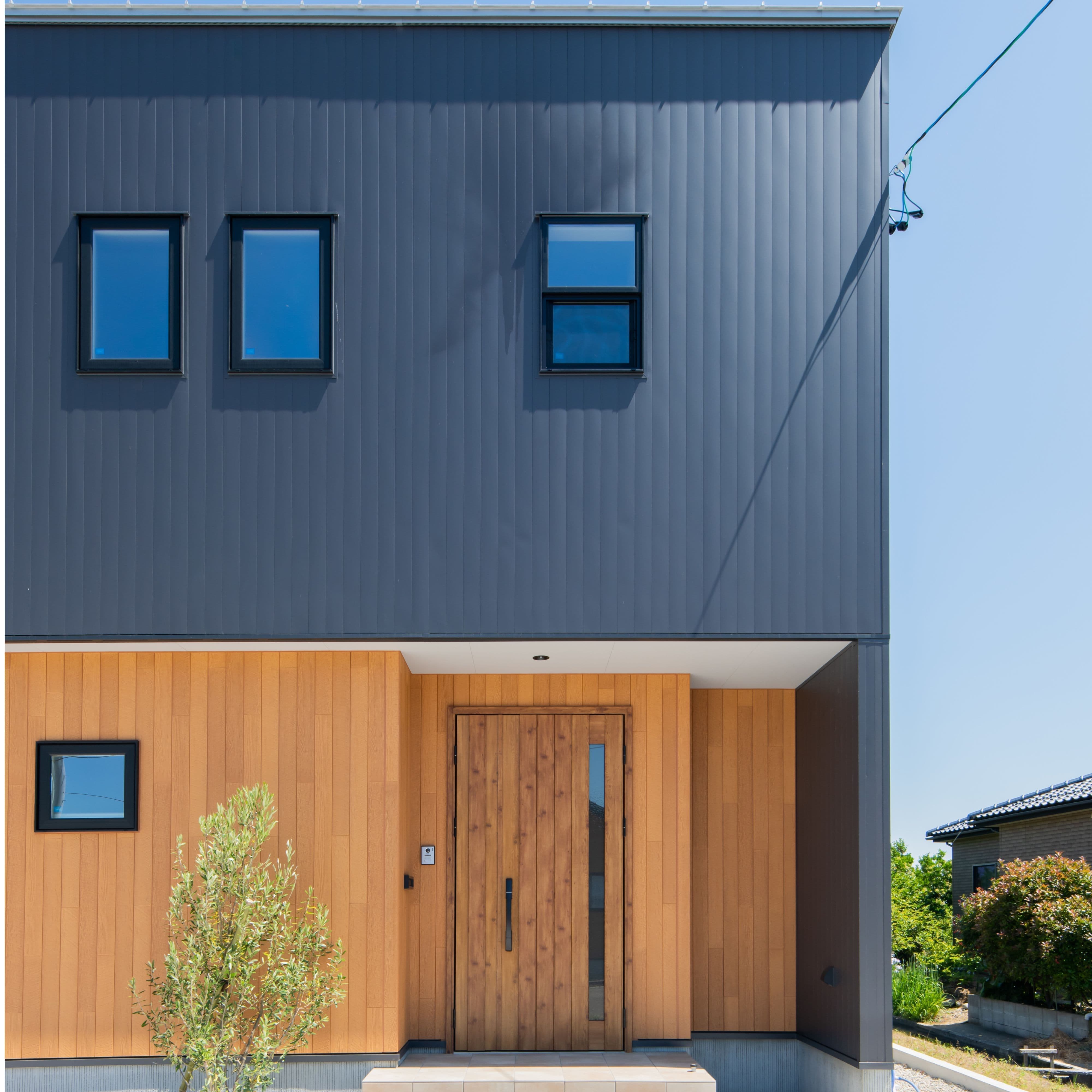 シンプルなキューブ型の総2階で、高耐久なガルバリウム鋼板と木調のサイディングのを組み合わせることで木調がアクセントになり暖かい印象も持てる外観にしました。