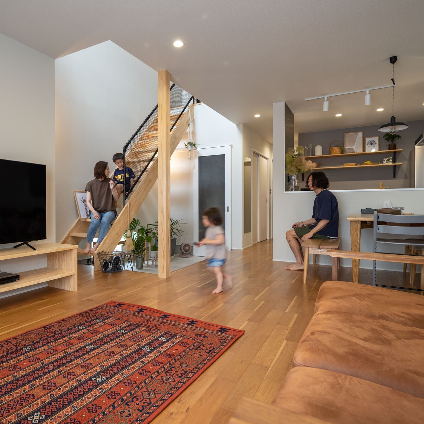 お子さんがリビングで遊んでいる様子を見渡せるようにキッチンを家の中心にプランニング。サイドフードにすることによりさらに見通しが良くなりました。