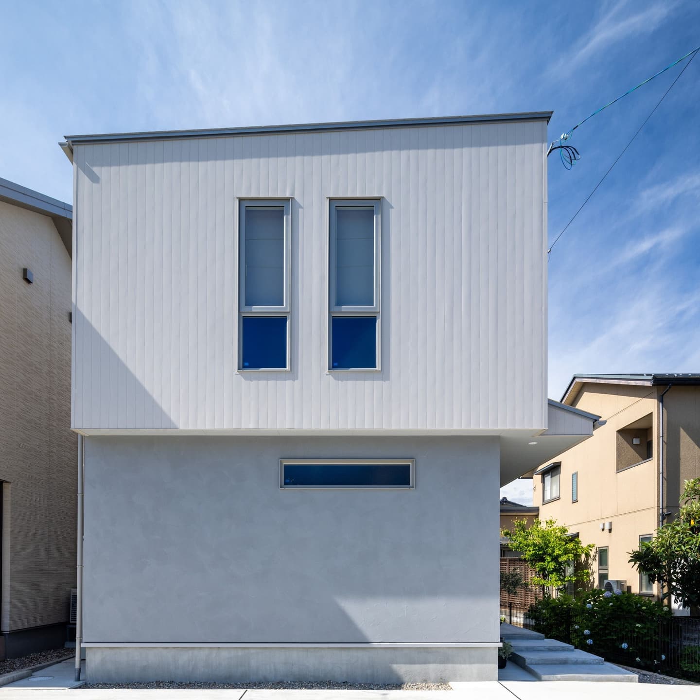 グレー×アイボリーで優しい雰囲気なシンプルなキューブ型ですが、ガルバリウム鋼板と塗り壁の素材感が違う2種類を組み合わせることでアクセントのある外観になりました!
