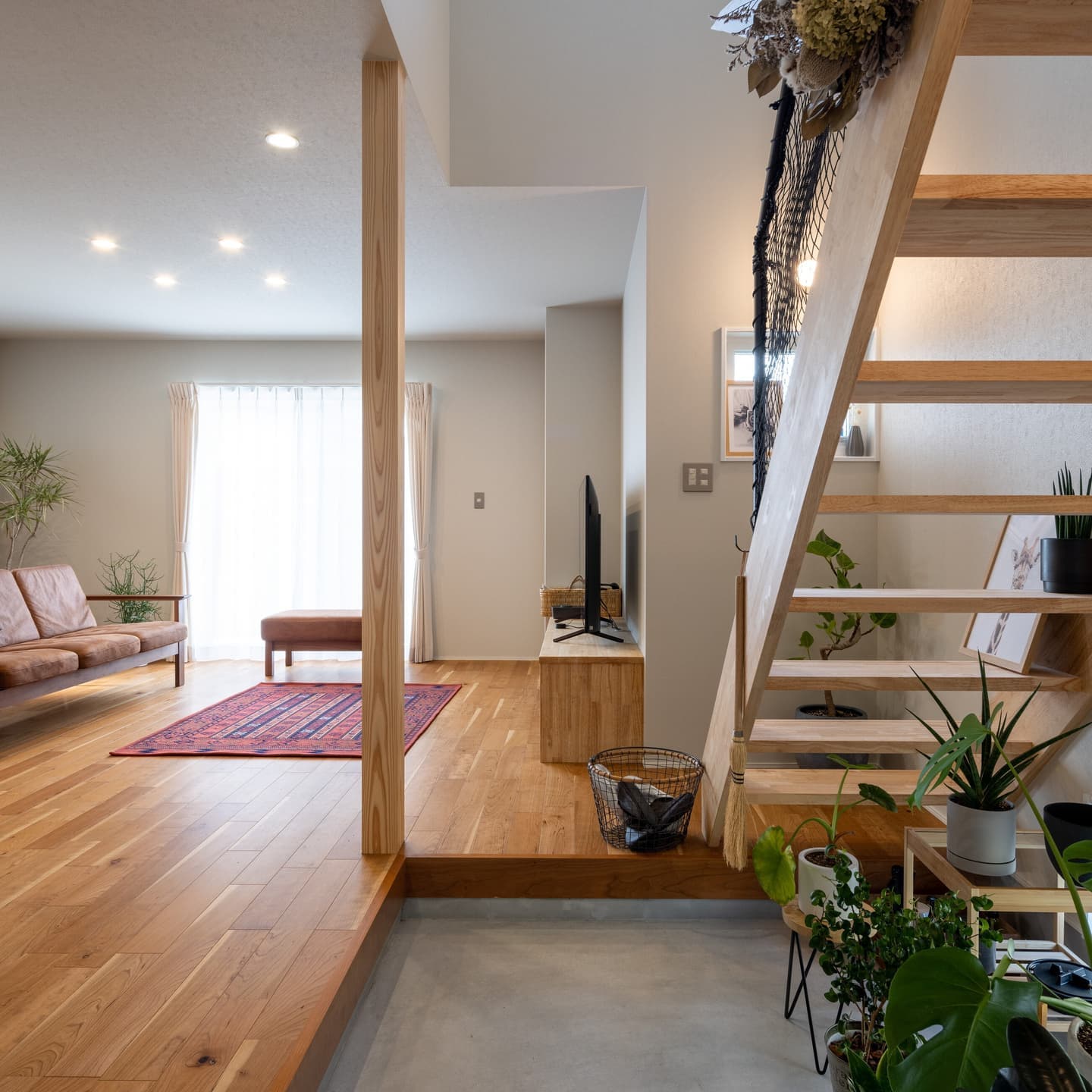 階段下を土間スペースに。観葉植物をたくさん置いてオシャレな空間になりました。